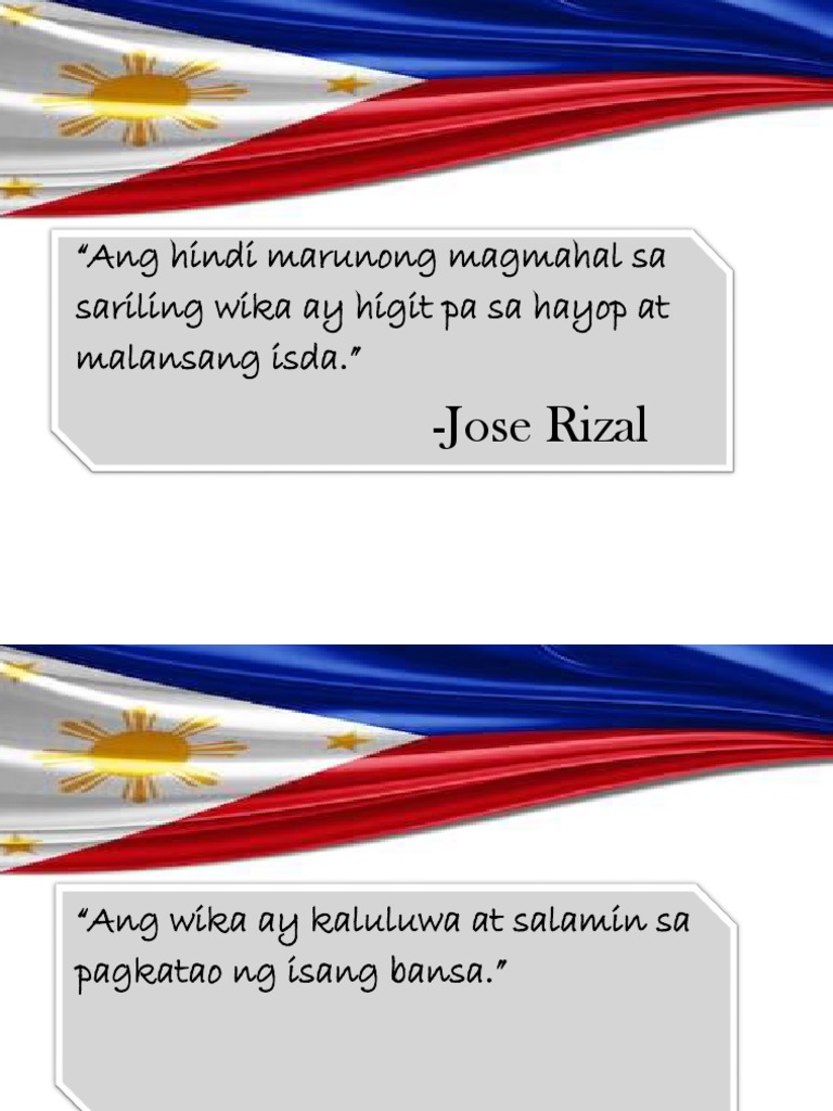Ang isang taong hindi marunong magmahal sa kanyang sariling wika ay nabubuhay sa isang mundong hindi kanya at sa kalauunan ang kanyang kaisipang Filipino ay manlulupaypay. Ang hindi marunong magmahal sa sariling wika ay higit pa sa hayop at malansang isda Iyan ang tanyag na kataga na nagmula pa sa ating pambansang bayani na si Dr. Ito ang tanyag na katagang nagmula sa ating pambansang bayani na si Gat.