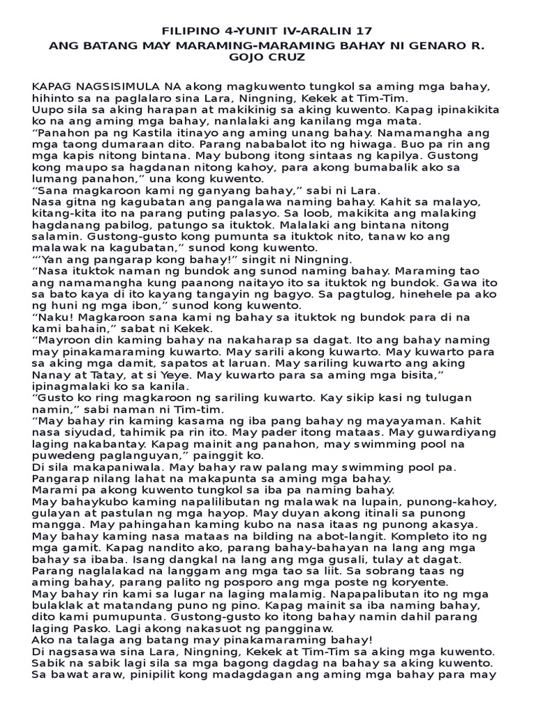 FILIPINO 4-YUNIT IV-ARALIN 17 ANG BATANG MAY MARAMING-MARAMING BAHAY NI GENARO R. Di nagsasawa sina Lara Ningning Kekek at Tim-tim sa aking mga kuwento. Gojo Cruz Malawak na lupain sa tuktok ng bundok o kaya sa tabi ng asul na dagat kay sarap sigurong magmay ari ng kahit isa sa mga itoNgunit nang n.