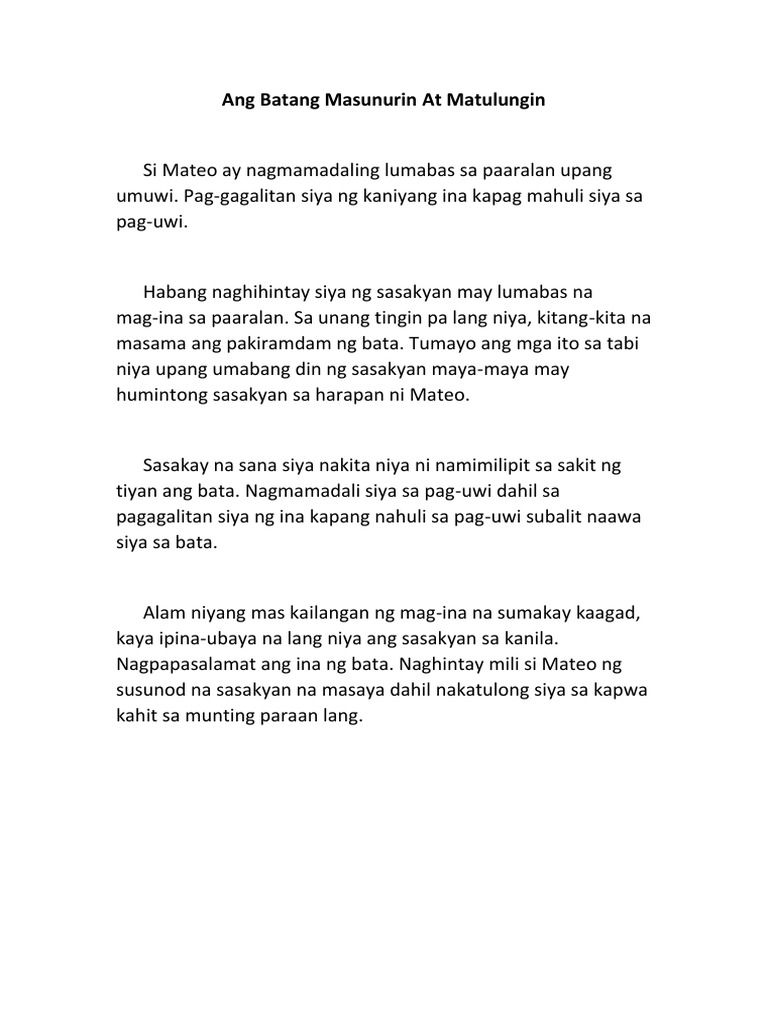 By Mikaela Alexis A. Human translations with examples. Martes Setyembre 27 2016 ANG BATANG MATULUNGIN AT MASUNURIN Si Paul ay nagmamadaling lumabas ng paaralan upang umuwi.
